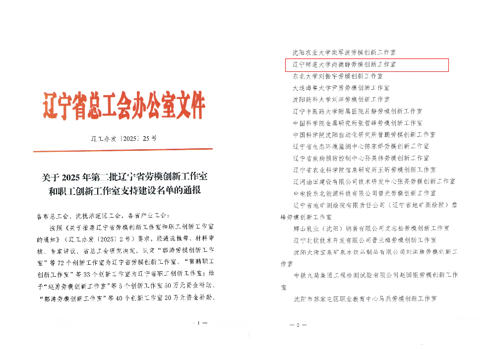 近日,辽宁省总工会正式下发《关于2025年第二批辽宁省劳模创新工作室和职工创新工作室支持建设名单的通报》(辽工办发〔2025〕25号),我院尚德静职工创新工作室凭借扎实的科研积累与突出的创新成效,成功获评“辽宁省劳模创新工作室”。这一荣誉不仅是对工作室领衔人尚德静及团队创新能力的高度肯定,更是我省总工会对我院深耕科研服务辽宁振兴的充分认可,为学校高质量发展再添闪亮名片。